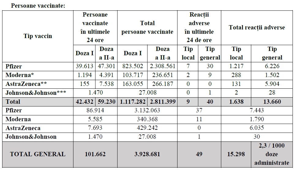 Peste 101.000 de persoane au fost vaccinate în ultimele 24 de ore anti-Covid în România – record zilnic până în acest moment. Dintre acestea 86.914 au fost imunizate cu Pfizer, 5.585 cu Moderna, 1.470 cu Johnson&Johnson și 7.693 cu AstraZeneca a anunțat Comitetul Naţional pentru Coordonarea Vaccinării anti-COVID. În total, de la debutul campaniei de vaccinare, aproape 3,93 milioane de persoane au fost inoculate cu unul dintre vaccinuri și au fost administrate aproape 6,6 milioane de doze de vaccin.