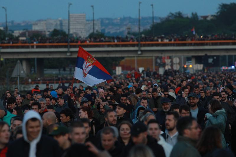 În cea de-a doua astfel de demonstrație în mai puțin de o săptămână, mulțimi de oameni au blocat un bulevard cheie și un nod de autostradă din Belgrad și un pod peste râul Sava, defilând în spatele unui banner negru pe care scria „Serbia împotriva violenței”.