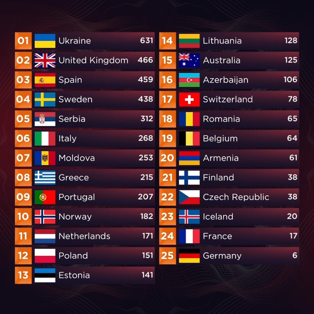 Pe locul al doilea, s-a clasat Marea Britanie, reprezentată de Sam Ryder, un cântăreț de 31 de ani celebrul pe rețelele de socializare. El a interpretat piesa „Space Man”. Următorii clasați au fost reprezentanții Spaniei, Suediei și Serbiei.